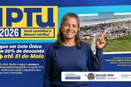 Prefeitura de Mucuri amplia prazo e oferece 20% de desconto no pagamento da cota única do IPTU 2026.