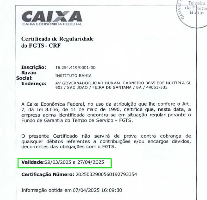Portanto a certidão/FGTS, vencida com a validade até 27/04/2025, mais a Certidão de Falência vencida com validade até 26/04/2025, juntamente com a assinatura do contrato em 07/05/2025, além do objeto contratado para realizar o concurso público totalmente fora do escopo do Instituto Bahia, tudo isso mostra e evidência uma sequência cronológica que demonstra claramente que, quando o contrato foi assinado, as duas certidões já estavam totalmente vencidas.
