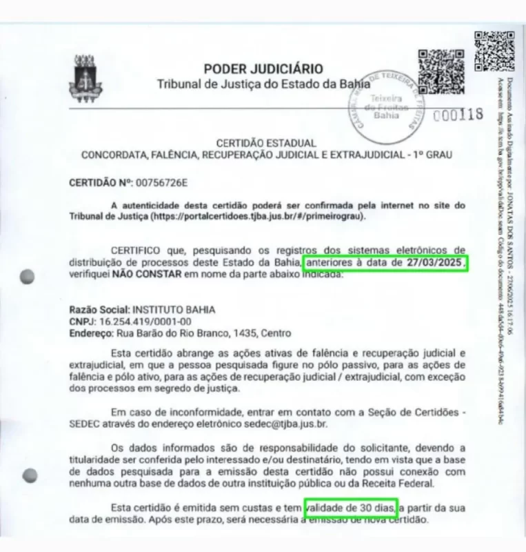 Já a Certidão de Falência e Concordata (TJ-BA) emitida em 27/03/2025, com validade de 30 dias, ou seja, até o dia 26/04/2025 como pode ser visto na foto abaixo. Por tanto a certidão se encontrava expirada uma vez que o contrato com a Câmara Municipal foi assinado no dia 07/05/2025.