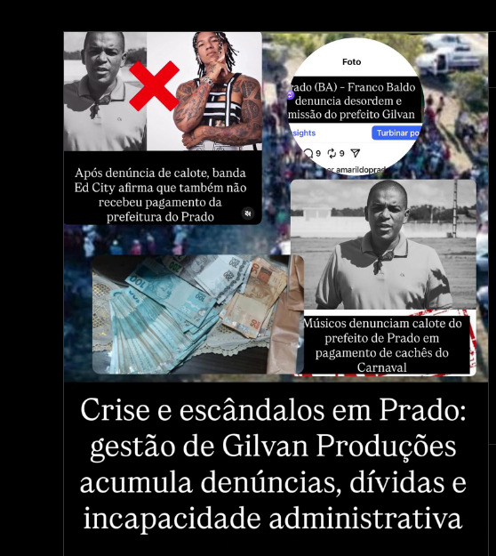 O prefeito do Prado- BA, Gilvan da Silva Santos (PSD) se tornou destaque no estado nos últimos dias, e teve sua imagem veiculada a fama de “Caloteiro”, ganhando as páginas dos jornais regionais, e perfis do Instagram, após músicos que se apresentaram no Carnaval 2025 de Prado, terem afirmado serem vítimas de calote, por parte do gestor municipal.