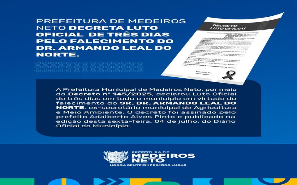 A Prefeitura Municipal de Medeiros Neto, por meio do Decreto nº 145/2025, declarou Luto Oficial de três dias em todo o município em virtude do falecimento do Sr. Dr. Armando Leal do Norte, ex-secret...