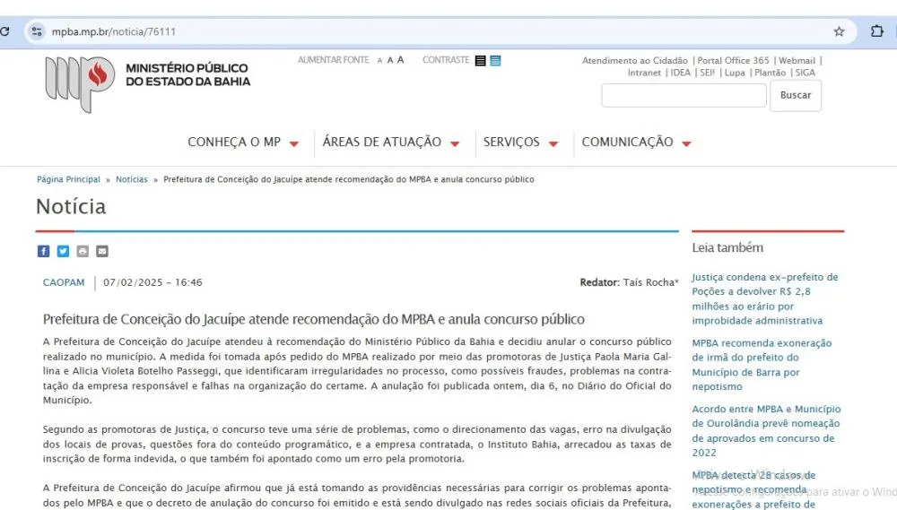 Tal como em Teixeira de Freitas -BA, em Conceição do Jacuípe o concurso começou a desmoronar, e em janeiro de 2025, o MP-BA, através da Recomendação IDEA nº 003.9.538541/2024, o MPBA, exigiu a anulação do certame.