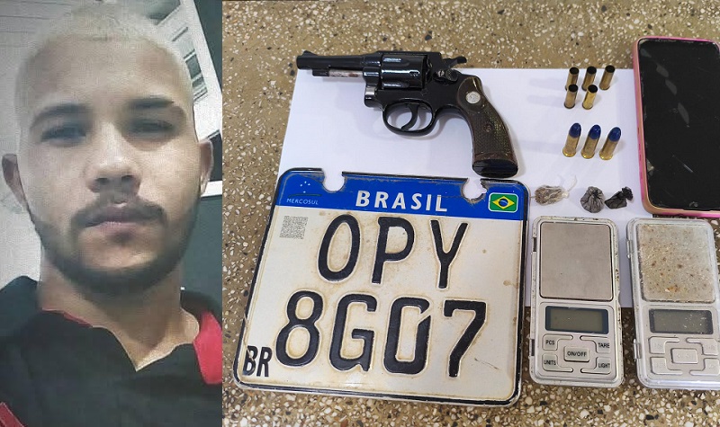 No interior da residência onde o confronto ocorreu, os policiais localizaram: 01 revólver calibre 32 (série 744899); 05 munições calibre 32 deflagradas; 03 munições intactas calibre 38; 03 papelotes de cocaína; 01 papelote de maconha; 02 balanças de precisão; 01 placa de motocicleta (OPY8G07) e 01 aparelho celular Motorola.