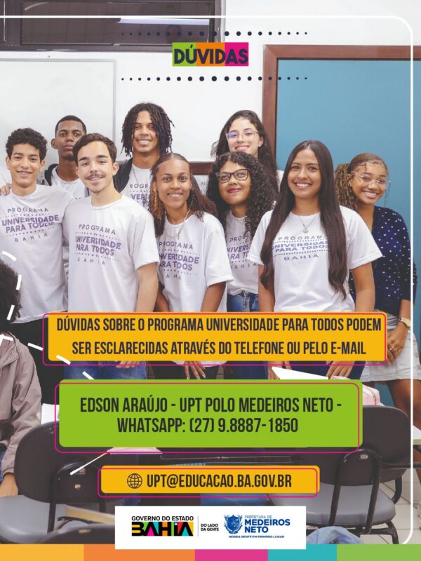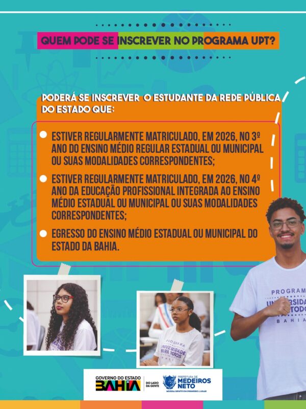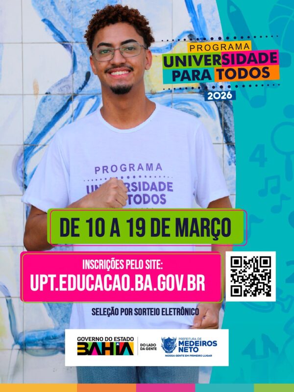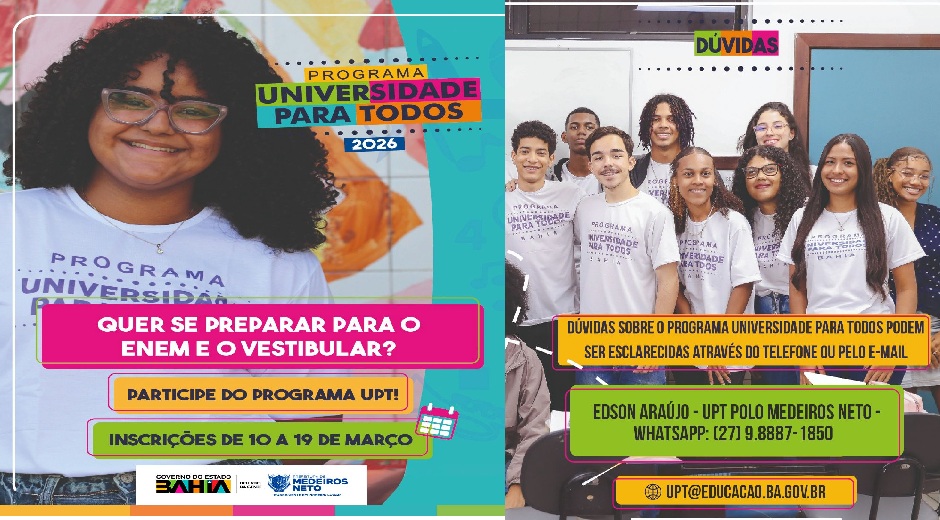 Estão abertas, de 10 a 19 de março, as inscrições para o programa Universidade para Todos (UPT) em Medeiros Neto. O programa, uma iniciativa do Governo do Estado executada pela Universidade Federal do Sul da Bahia (UFSB), conta com o apoio estratégico da Prefeitura Municipal, via Secretaria de Educação, e do CETEP Medeiros Neto.