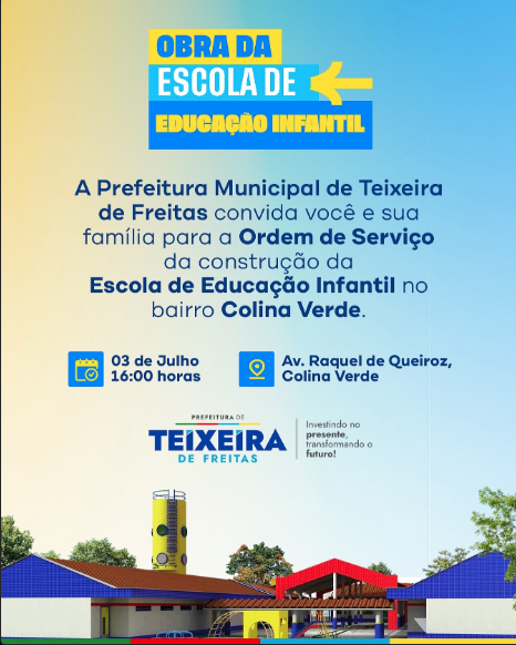 A Prefeitura Municipal de Teixeira de Freitas convida toda a população teixeirense para a assinatura da ordem de serviço para a construção da Escola Infantil no bairro Colina Verde nesta quinta-feira (03), às 16 horas, na Avenida Raquel de Queiroz.