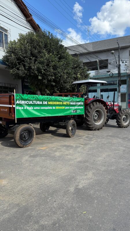 A Prefeitura de Medeiros Neto, por meio da Secretaria Municipal de Agricultura, Desenvolvimento Rural e Pecuário (SEMAGRI) acaba de conquistar um marco histórico: o primeiro trator destinado oficialmente à pasta. A conquista foi possível graças à articulação conjunta da deputada estadual Kátia Oliveira, dos vereadores Deó, Pintão e André, que se uniram em favor do fortalecimento da agricultura local.