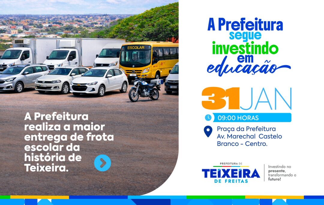 A Prefeitura de Teixeira de Freitas realiza neste sábado (31), às 9h, na Praça da Prefeitura, a maior entrega de veículos já destinada à Rede Municipal de Ensino. A iniciativa amplia a estrutura de transporte, apoio e logística da educação municipal, fortalecendo o atendimento às unidades escolares da sede e da zona rural.