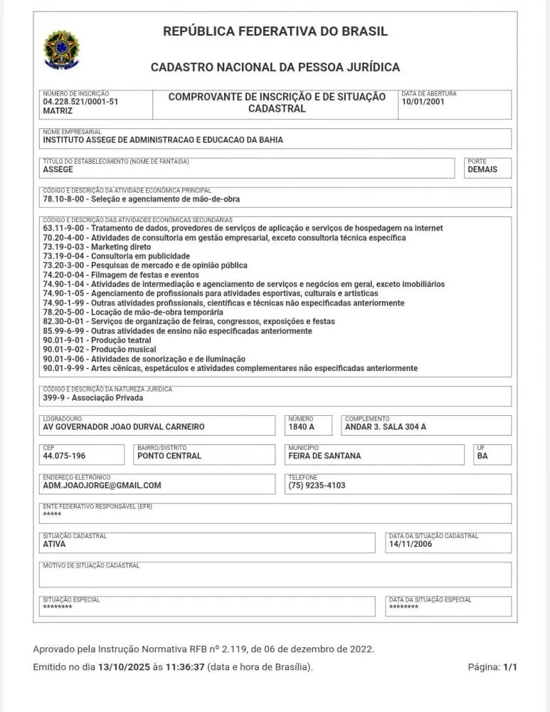 A outra é o INSTITUTO ASSEGE DE ADMINISTRACAO E EDUCAÇÃO DA BAHIA que tem sua suposta sede no seguinte endereço:  Av. GOVERNADOR JOÃO DURVAL CARNEIRO 1840 A – CENTRO, FEIRA DE SANTANA/BA.