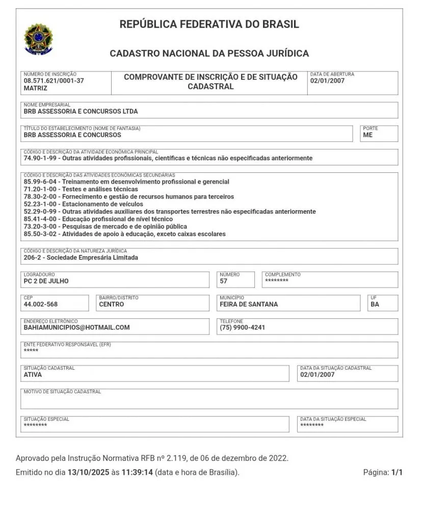 Descobriu-se que as outras duas empresas convidadas a participar do processo prestando cotações para “balizar” uma pesquisa de preços também não possuem sede física comprovada. O INSTITUTO BRB ASSESSORIA E CONCURSOS LTDA, CNPJ 08.571.621/0001-37 que tem seu endereço na PRACA 2 DE JULHO, 57 – CENTRO, FEIRA DE SANTANA/BA não passa de uma sede fictícia, conforme pode ser notado através do seu cartão CNPJ disponibilizado pela Receita Federal e também em vídeos gravados pelo repórter Vanderlei Filho.