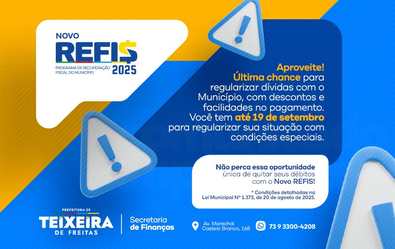 A Prefeitura de Teixeira de Freitas acaba de lançar o Novo Programa de Recuperação Fiscal (Novo Refis 2025). A iniciativa foi criada para dar chance a quem tem dívidas com o município, oferecendo de...