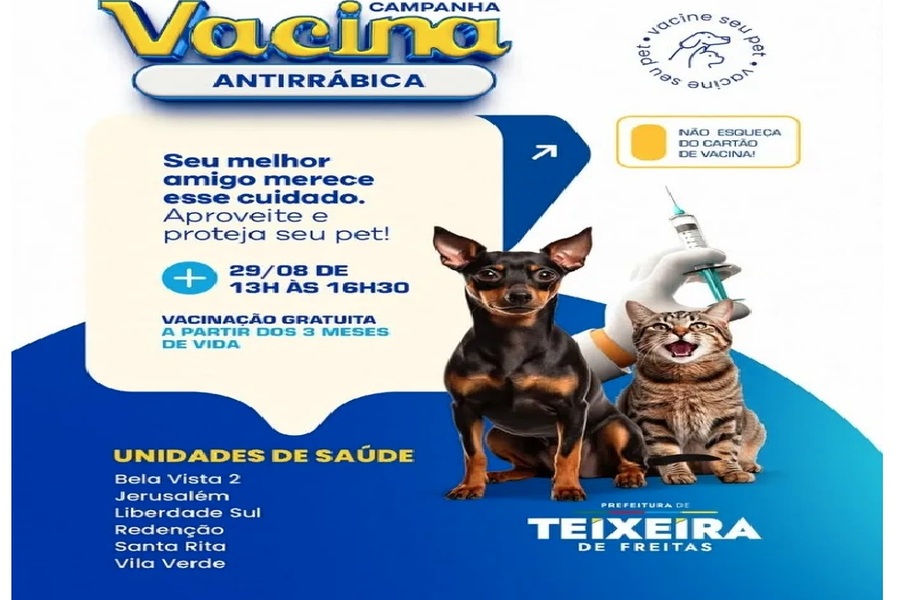 A Prefeitura de Teixeira de Freitas realiza, nesta sexta-feira (29), a Campanha de Vacinação Antirrábica voltada para cães e gatos a partir dos três meses de vida. A ação acontece das 13h às 16h30...