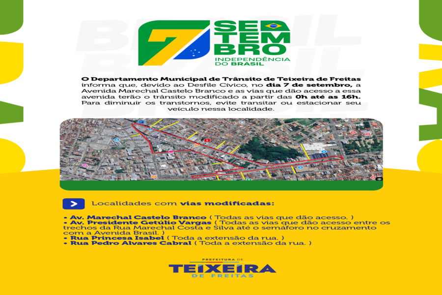 O Departamento Municipal de Trânsito de Teixeira de Freitas anunciou mudanças no tráfego de veículos para este sábado, 7 de setembro, em razão do Desfile Cívico da Independência. As alterações terão...