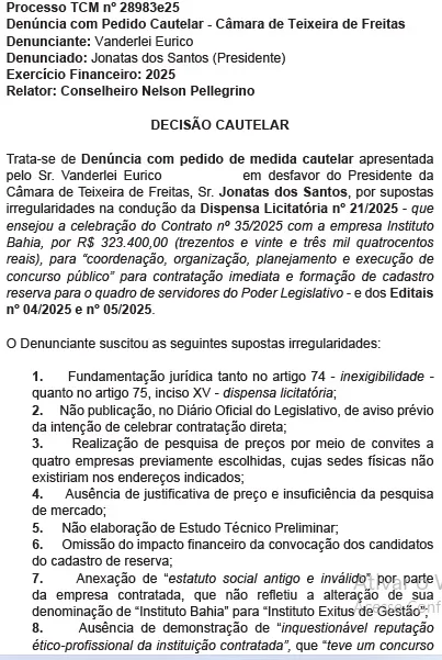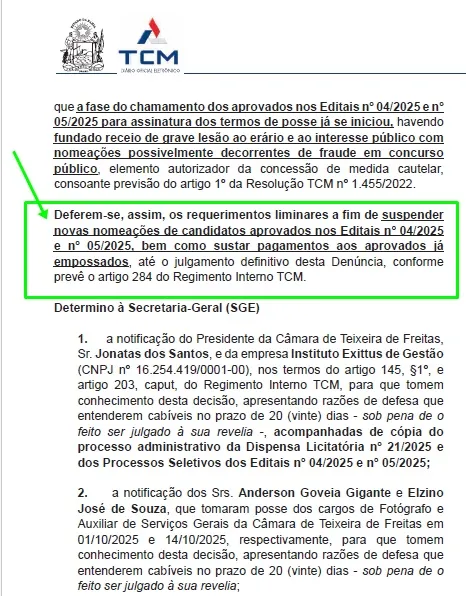 Em uma decisão que marca a história do jornalismo investigativo de Teixeira de Freitas, o Tribunal de Contas dos Municípios da Bahia (TCM-BA) acatou a denúncia apresentada pelo Zero Hora News. e determinou a suspensão imediata de todas as nomeações do concurso público da Câmara Municipal de Teixeira de Freitas, além de sustar os pagamentos dos servidores já empossados!